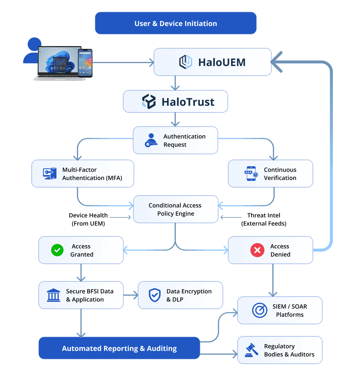 HaloTrust integrates with Active Directory and HRMS for end-to-end identity lifecycle management, enforcing conditional access and fraud detection in BFSI environments.