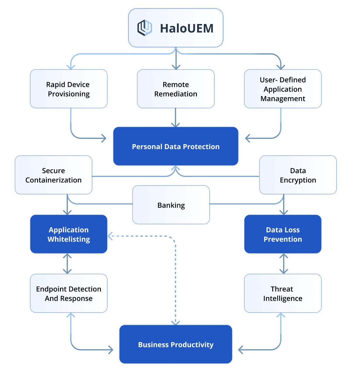 HaloFort seamlessly integrates HaloUEM for endpoint management with HaloTrust for zero trust security, leveraging AI for autonomous policy enforcement and real-time threat response.