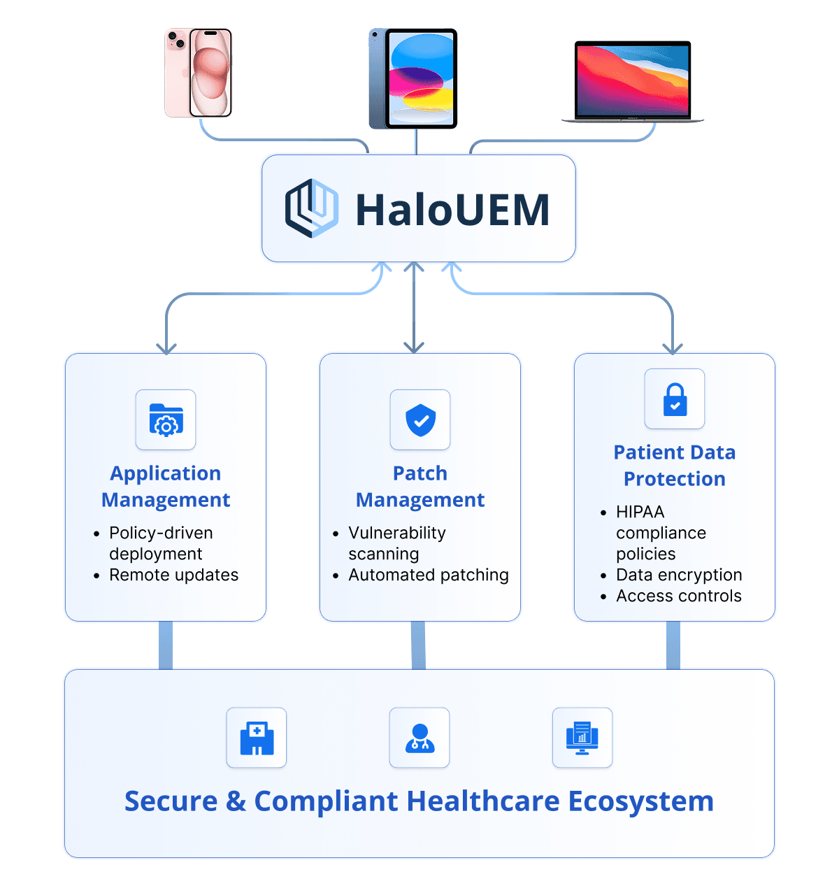 HaloFort's UEM automates patching and policies to reduce breach risks by 25%, ensuring HIPAA compliance amid rising cyber threats in healthcare.