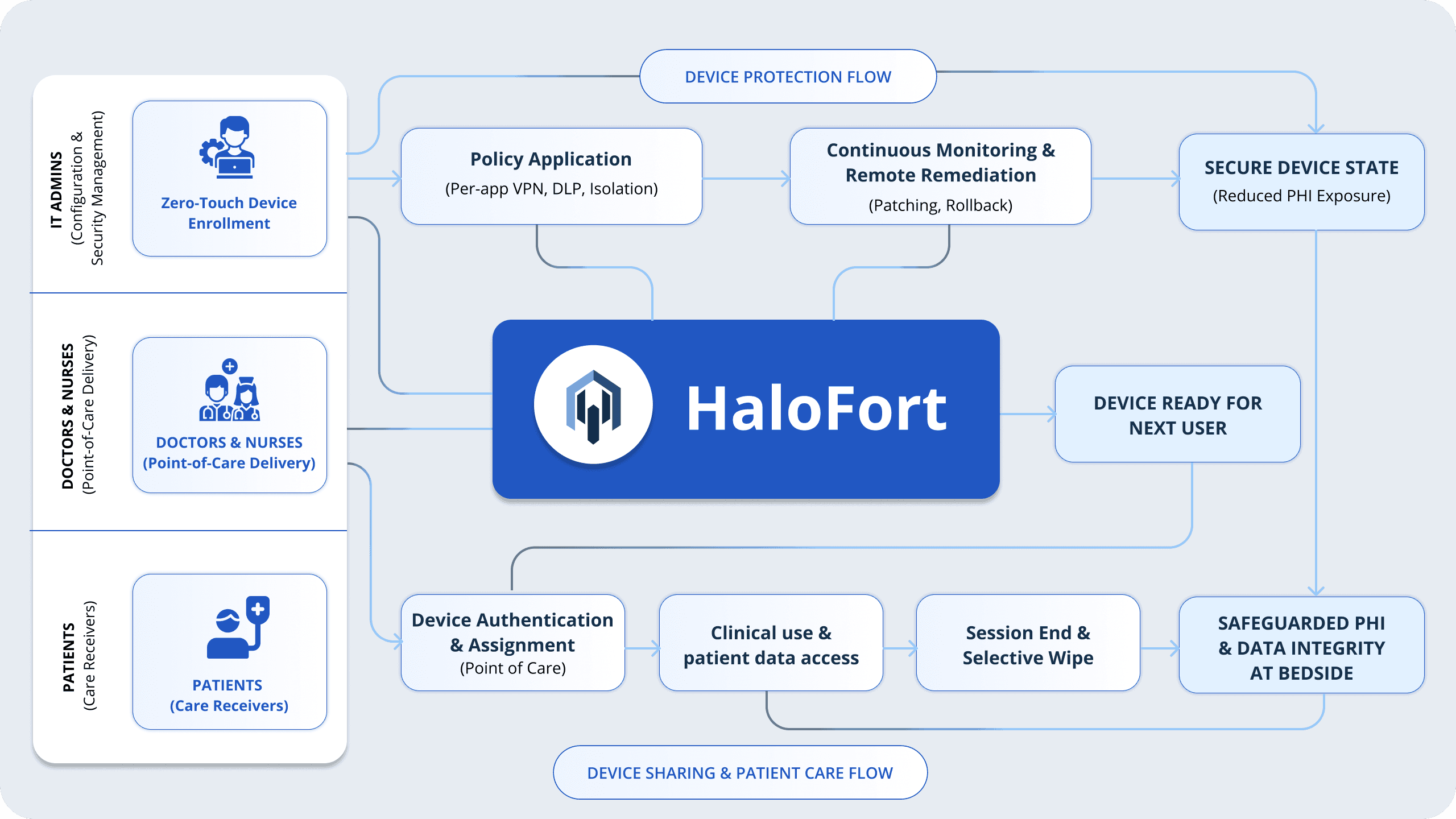 HaloFort's UEM platform simplifies provisioning and management with intuitive dashboards, bulk enrollment, and automated policies, enabling quick setup and oversight of shared devices for seamless healthcare operations.