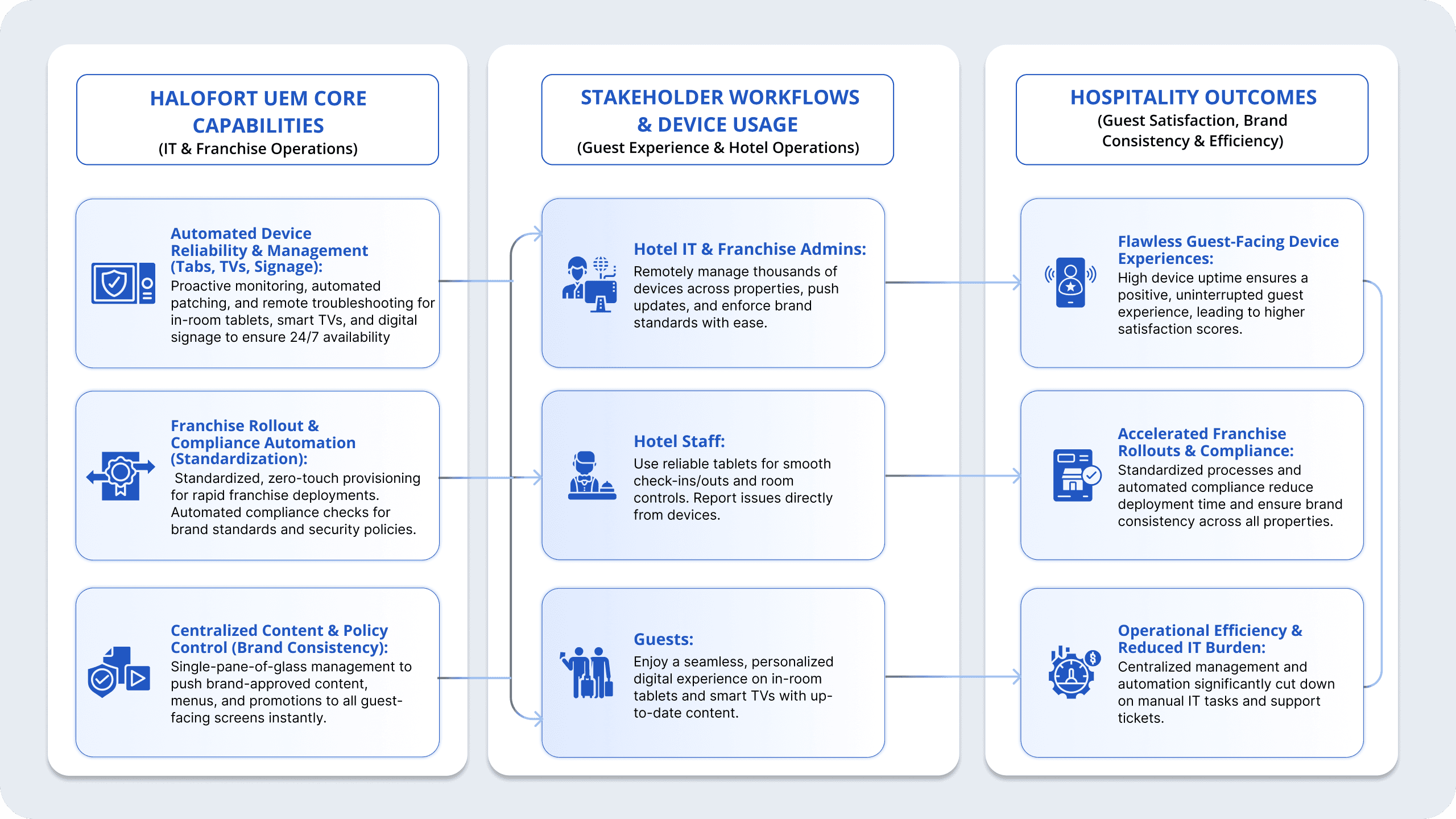 Standardize device policies and rollouts across properties and franchises to cut compliance and support overhead by ~30%.