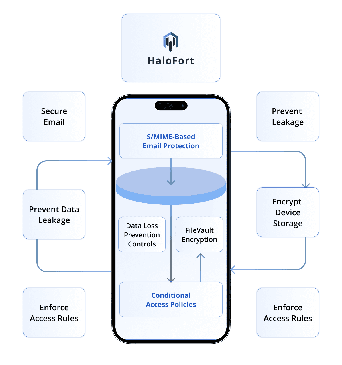 Enforce encrypted email profiles and conditional access, integrating with identity providers to block noncompliant devices without excessive prompts.