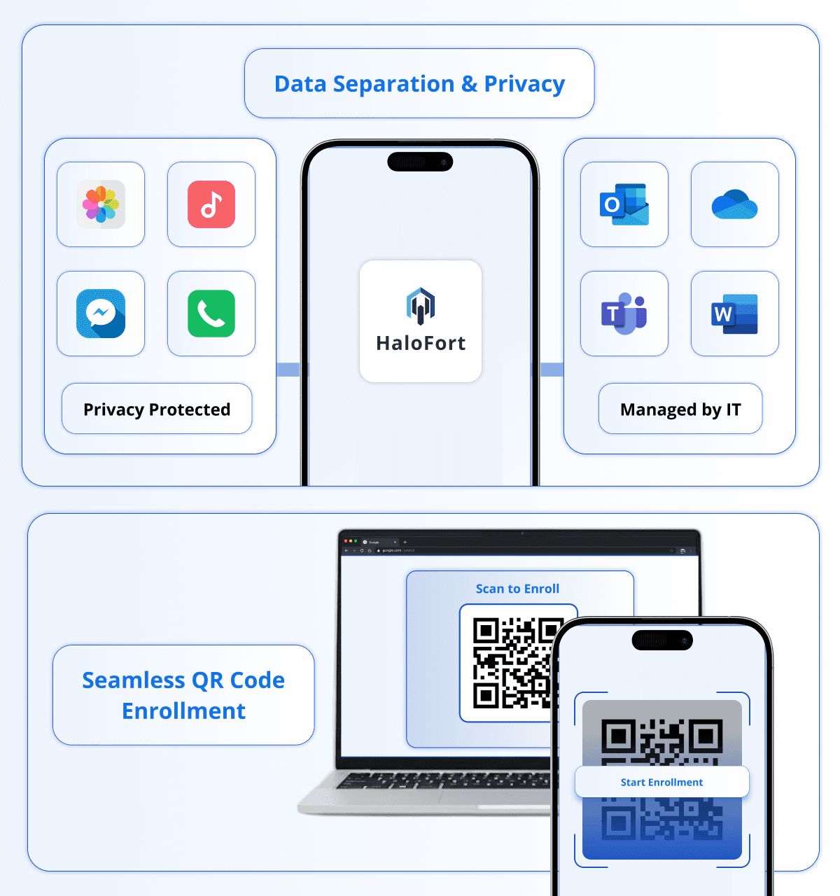 HaloFort uses QR/link enrollment, creates segregated profiles, and enforces remote policies for secure hybrid management.